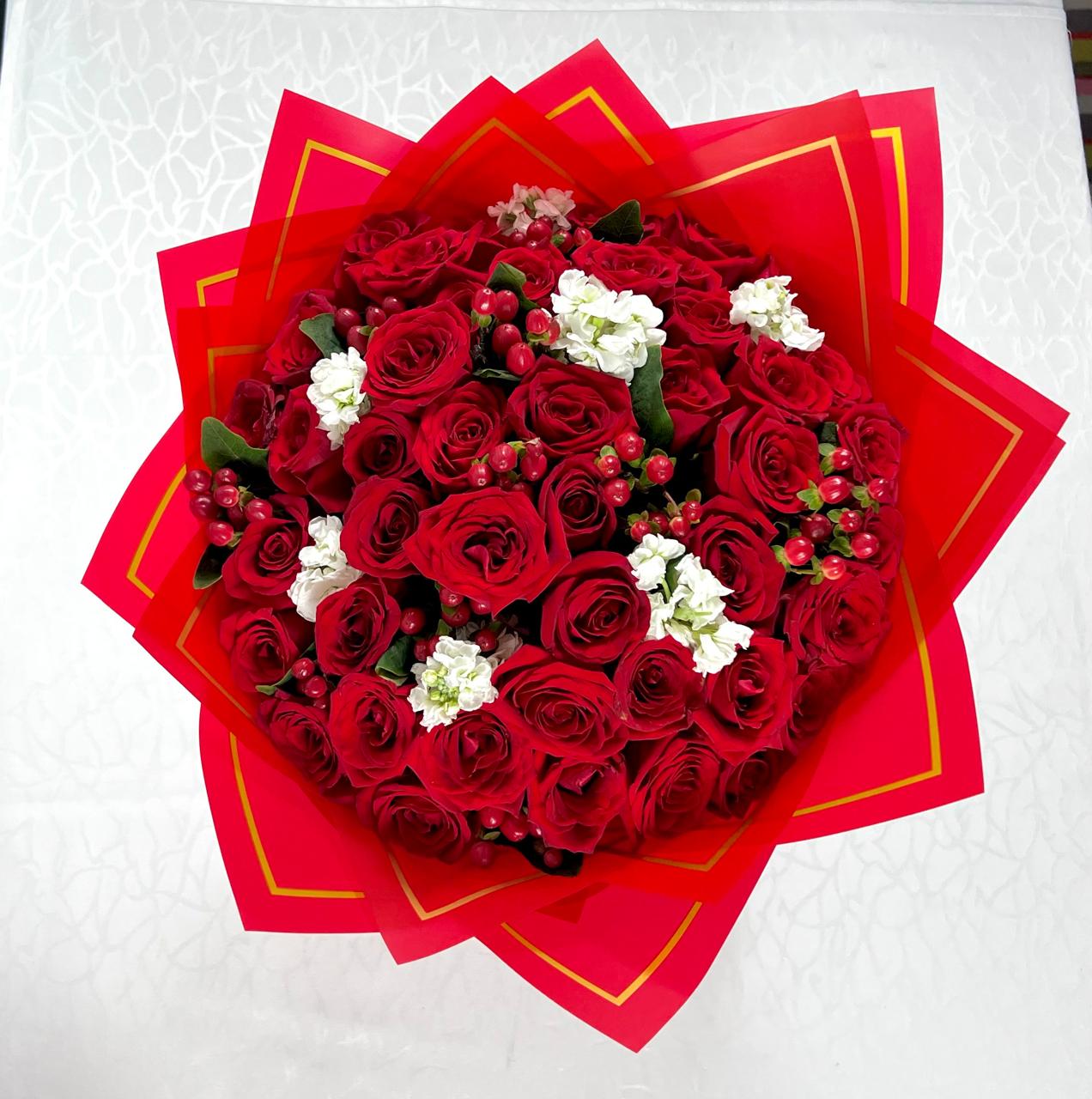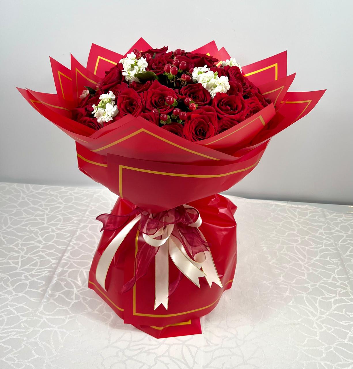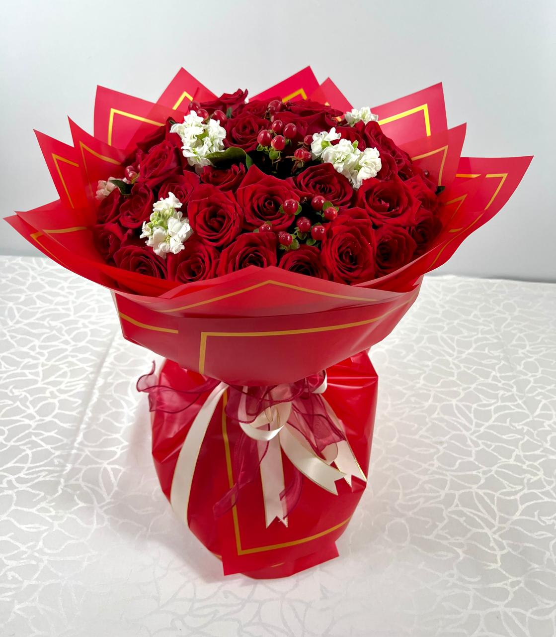 Indulge in the passionate embrace of the Crimson Kiss, a stunning floral arrangement that exudes romance and elegance. This breathtaking bouquet features a captivating combination of 40 premium Ecuadorian red roses, symbolizing love, passion, and beauty. The arrangement is further enhanced with delicate white matthiola, adding a touch of innocence and purity, and vibrant red hypericum berries, representing eternity and life. This exquisite creation is the perfect way to express your deepest emotions, celebrate special occasions, or simply surprise a loved one.